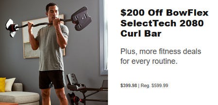 Stop by our store and enjoy $200 off on BowFlex SelectTech 2080 Curl Bar. Plus, more fitness deals for every routine.