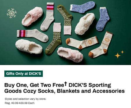 Shop in store and enjoy buy one, get two free DICK'S Sporting Goods cozy socks, blankets and accessories.