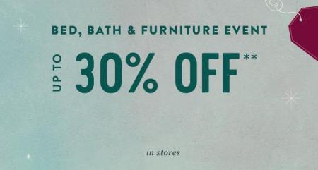 Stop by and get up to 30% off on bed, bath & furniture in store for a limited time.