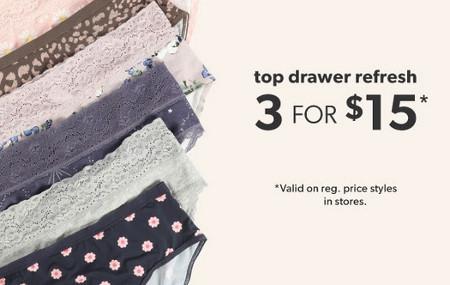 Get it now! Shop in store and get 3 for $15 panties.