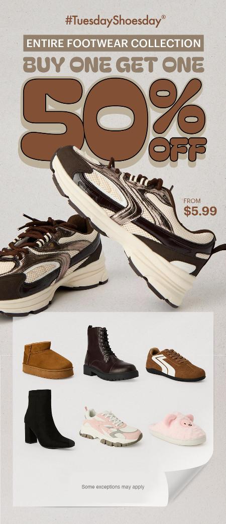 Shop in store today and get the entire footwear collection at buy one, get one 50% off.
