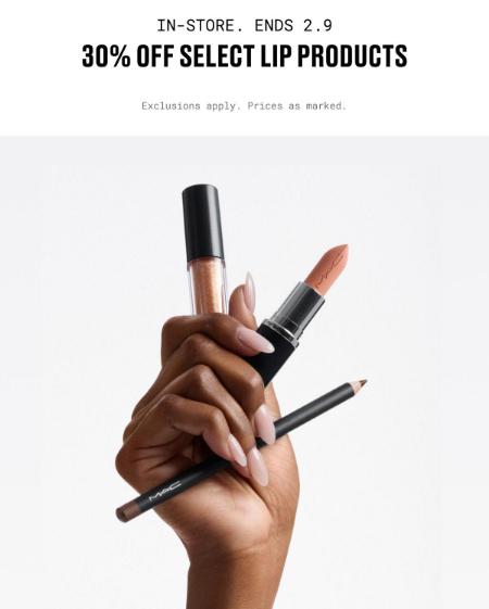 Shop in store and take 30% off on select lip products for a limited time.