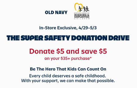 Offer valid at Old Navy stores in the U.S. (including Puerto Rico) only between 4/29/2026 through 5/3/2026. Discount applied at register at time of $5+ donation and qualifying purchase. Discount does not apply to Clearance, Gift Cards, Register Lane items, jewelry, sunglasses, products with any third-party branding, Old Nacy Beauty Co., shipping and handling, taxes and prior purchases. No adjustments on previous purchases. Not valid for cash or cash equivalent. Gap Inc. employees are not eligible for this discount. Limit one discount per eligible transaction. The National Center for Missing & Exploded Children is receiving the donation (www.ncmec.org/oldnavysafety). The National Center for Missing & Exploited Children and Old Navy make no representations about the tax consequences of the donation. No donation receipt will be provided. Customers should consult their own tax advisors. The National Center for Missing & Exploited Children's name and logo are used with its permission, which in no way constitutes an endorsement, expressed or implied, of any product or company.
